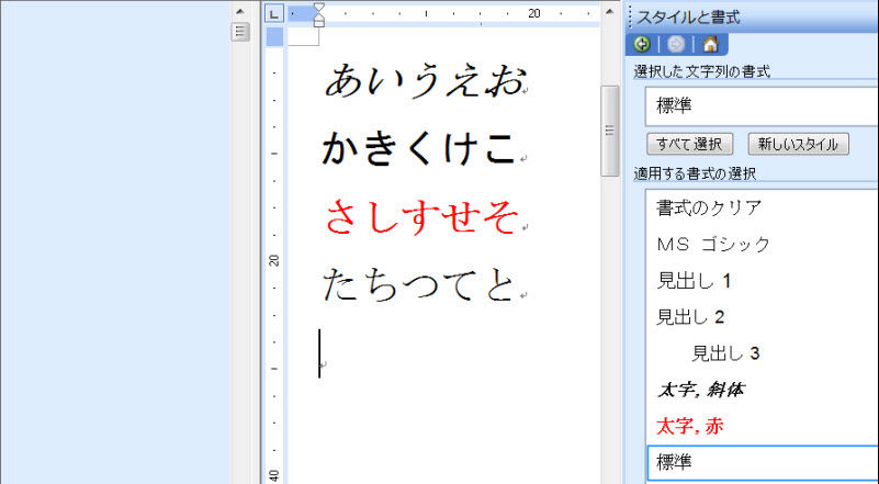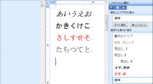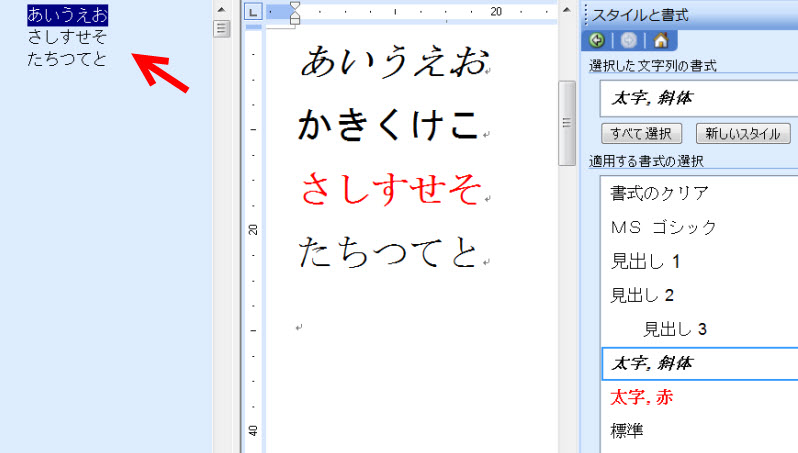 たとえば、以下の設定では、「あいうえお」、「さしすせそ」、「たちつてと」の3つの段落が見出し設定されて、左側の見出しマップに表示されています。