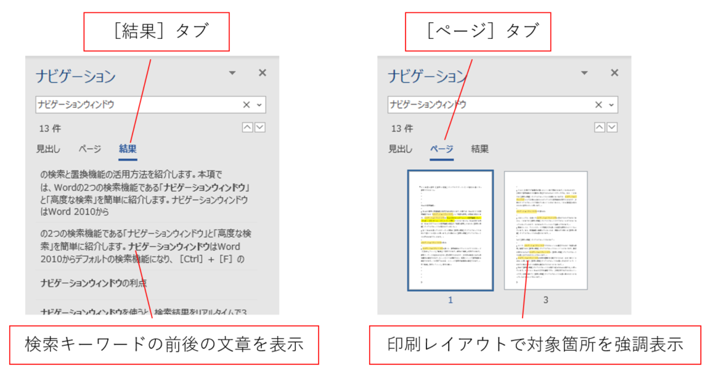 [ナビゲーション]ウィンドウを使うと、検索結果をリアルタイムで3つのモード(「見出し」「ページ」「結果」)で表示できます。通常は「結果」が表示されます。検索キーワードが含まれる文の一覧が表示されるので、文字列を確認しながら該当箇所を確認できます。[ページ]タブを選択すると、印刷レイアウトで検索結果を確認できます。この表示であれば、検索対象箇所を直感的に確認できます。