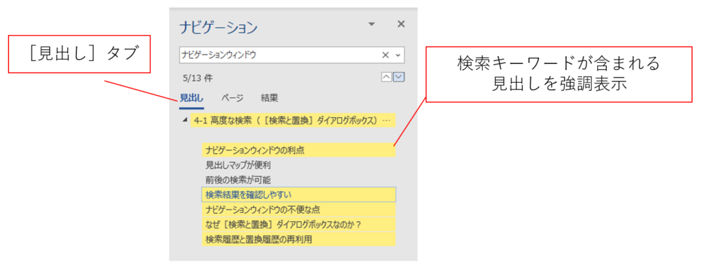 [見出し]タブを選択すると、検索結果を見出しに紐づけて表示できます。かつて「見出しマップ」と呼ばれていた表示形式です。[ナビゲーション]ウィンドウでは検索キーワードが含まれる見出しが強調表示されるため、検索箇所がどの見出しの下にあるのかを視覚的に確認できます。
