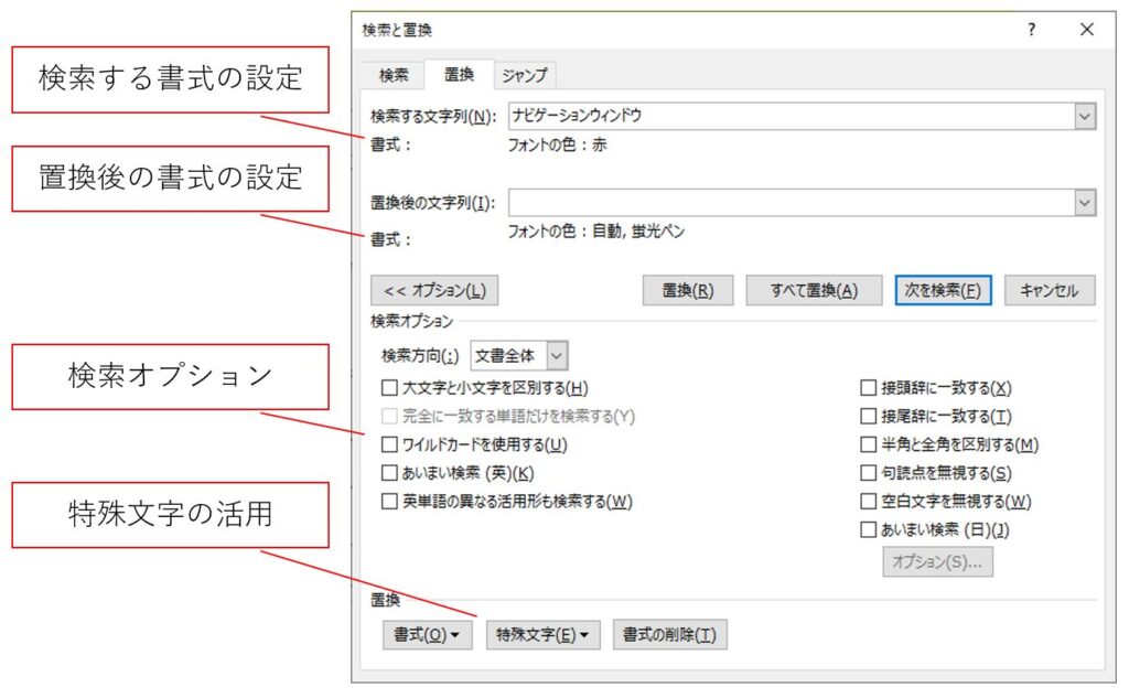 何よりも、検索条件を確認しながら検索ができるのが利点です。そしてオプションの設定がしやすく、ワイルドカードや特殊文字を用いる検索もできます。文字や段落書式、スタイルを検索や置換の条件にも設定できます。これらは、目的とあわせて使い方を学ぶのがよいので、次項以降で具体例とともに紹介します。