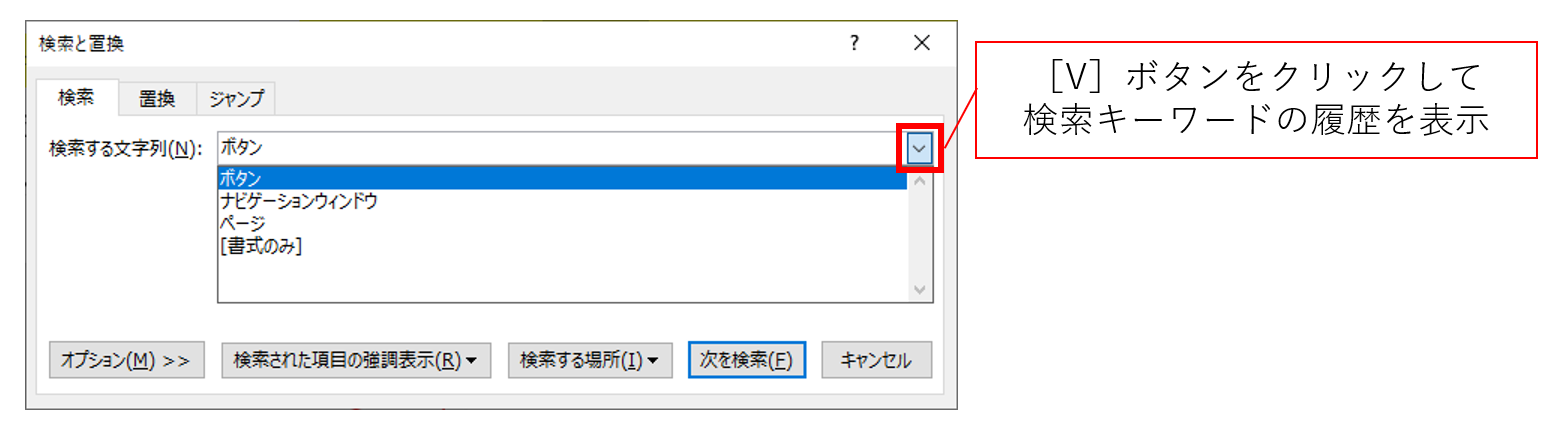 さらに、検索や置換に用いた文字列の履歴が残るので、キーワードを再利用できます。これが意外と便利です。[ナビゲーション]ウィンドウでは履歴を使えないのが残念です。
