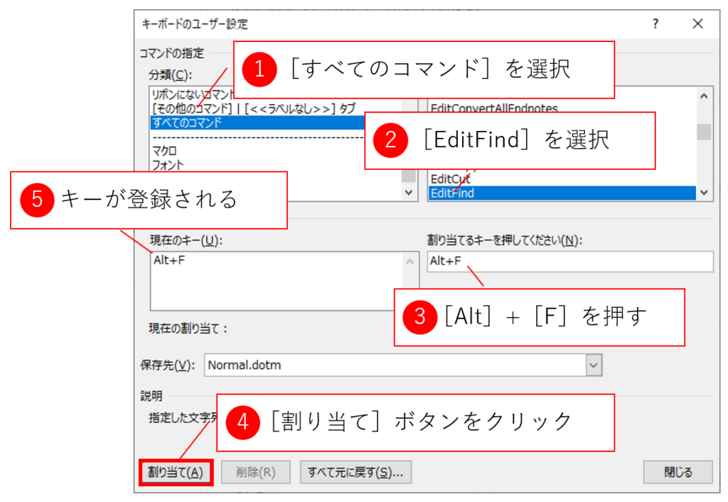 ショートカットキーを登録するコマンド名は「EditFind」です。図のようにこの項目を選択して[Alt]+[F]を登録します。これで思い立ったらすぐに[検索と置換]ダイアログボックスを使えるようになります。