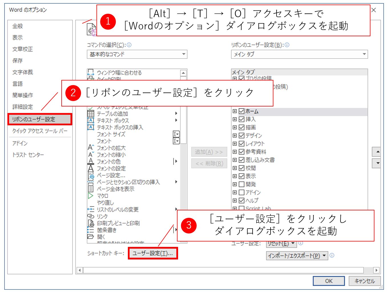 それ以外では、[Alt]→[T]→[O]のアクセスキー([Alt]キー、[T]キー、[O]キーを順番に1つずつ押す方法)で[Wordのオプション]ダイアログボックスを起動します。