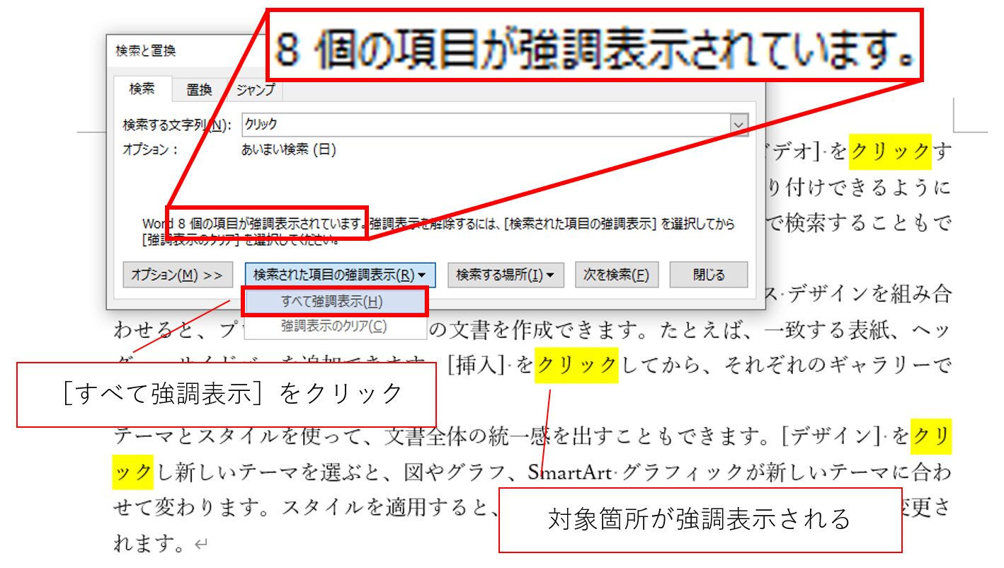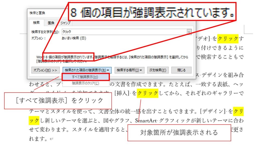 [検索と置換]ダイアログボックスにも、ヒット箇所を数え対象箇所を強調表示する機能があります。[検索された項目の強調表示]プルダウンメニューの[すべて強調表示]をクリックします。すると、対象箇所が強調表示され、対象箇所の数が表示されます。