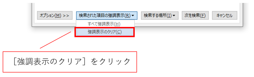 この強調表示は、ファイルをクリックしたりスクロールしたりしても解除されません。しかし、文字入力や削除などの編集作業をすると強調表示の色を消せます。他にも、[検索と置換]ダイアログボックスの[検索された項目の強調表示]プルダウンメニューの[強調表示のクリア]をクリックしても解除できます。