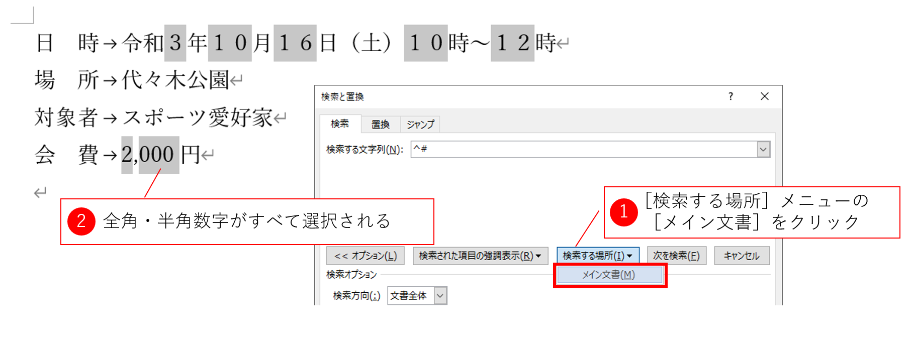 さて、次はこの検索条件に該当する箇所をすべて選択します。[検索する場所]プルダウンメニューの[メイン文書]をクリックしてください。すると、該当箇所が同時に選択されます。