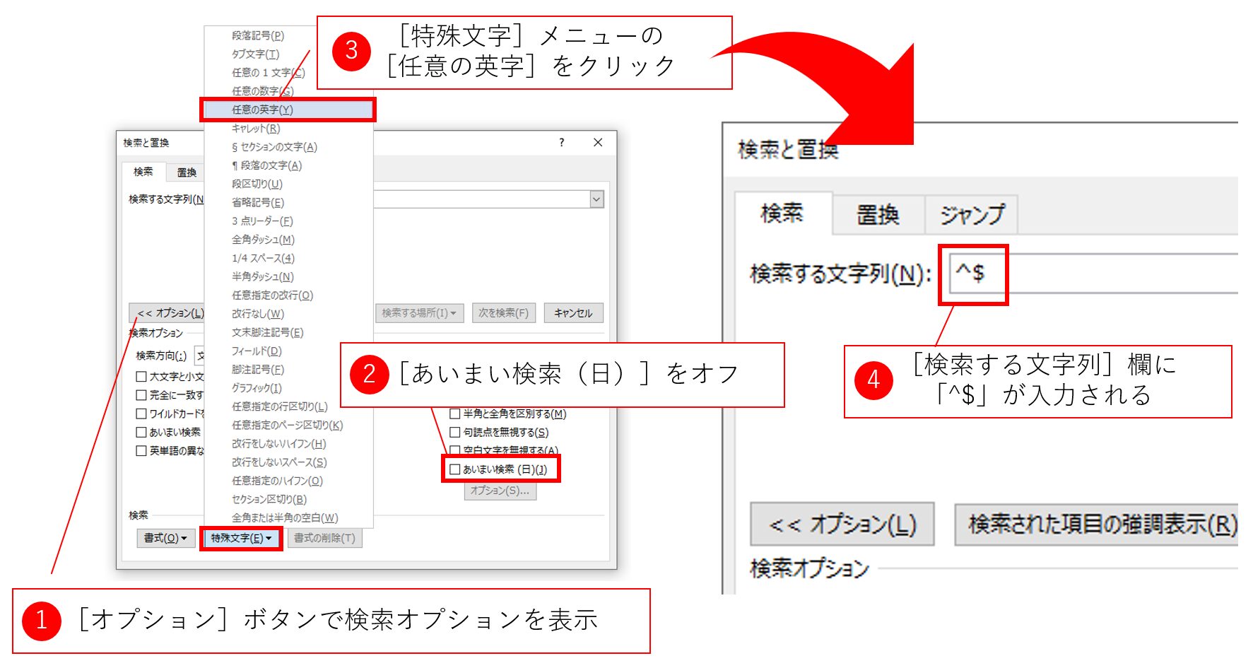 今回は以下の3つの技を組み合わせます。本ブログで何度か出てきている「特殊文字」や「検索する場所」を使います。