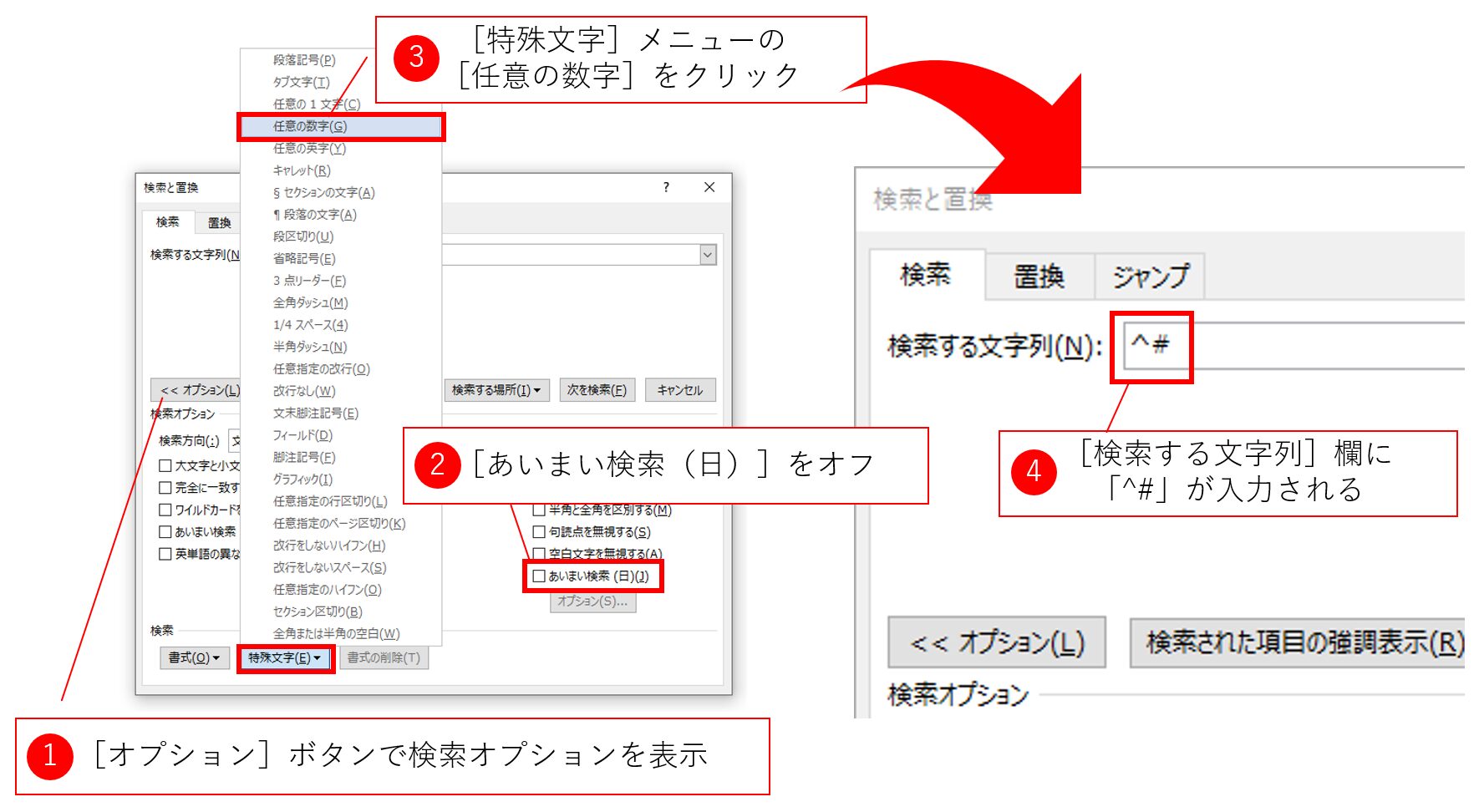 [検索と置換]ダイアログボックスの[検索]タブを表示し、[検索する文字列]欄に「^#」を入力します。半角で直接入力してもいいですし、[特殊文字]メニューから選択してもかまいません。この特殊文字は数字1文字に該当します。全角数字も半角数字も区別せずに検索できます。