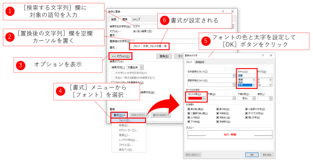 手順は以下の通りです。[検索する文字列]欄に対象の語句(今回の例では「ビデオ」)を入力した後に、以下の方法で置換後の文字列の書式を設定します。「蛍光ペンを仕事で活用する方法」紹介した例で、特定の語句を蛍光ペンで着色する例を紹介しました。この場合と同じように、[書式]メニューから操作をします。
