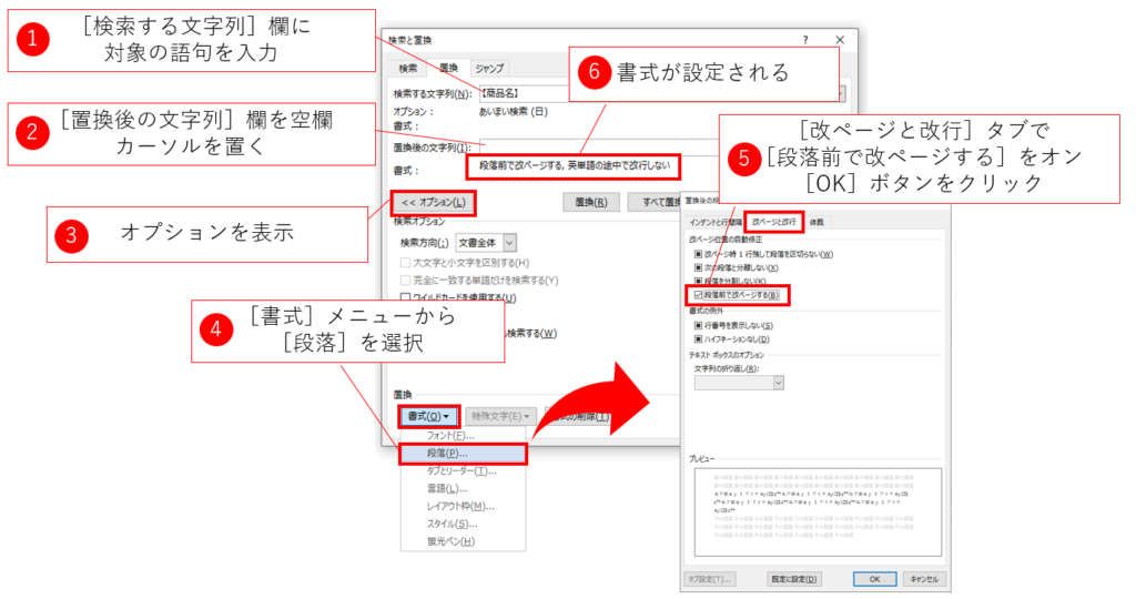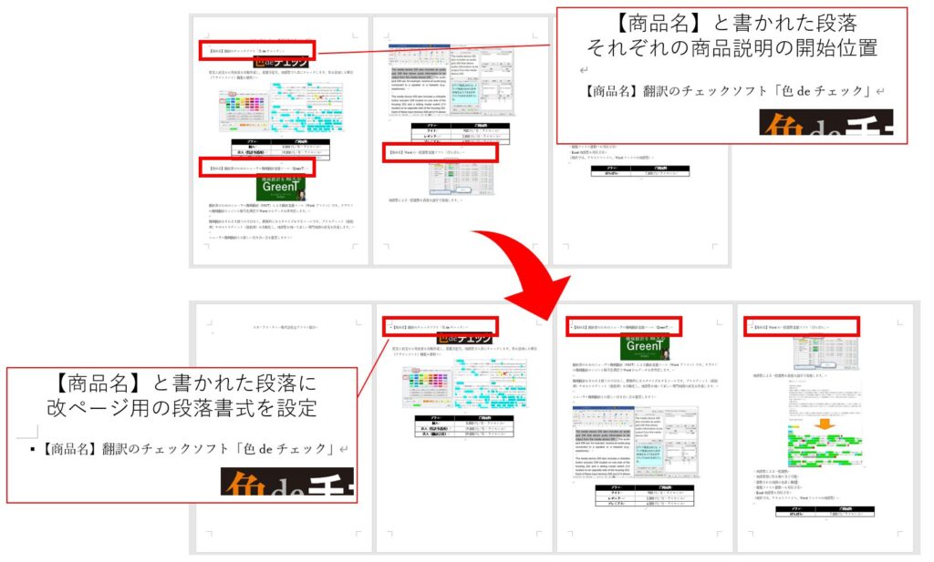 このような処理では、対象の文書の表記ルールの特徴を利用して検索条件を作ります。今回の例では、改ページ対象の段落には「【商品名】」と書かれているので、この文字列で対象となる段落を検索しました。段落書式も文字書式と同様の手順で設定します。