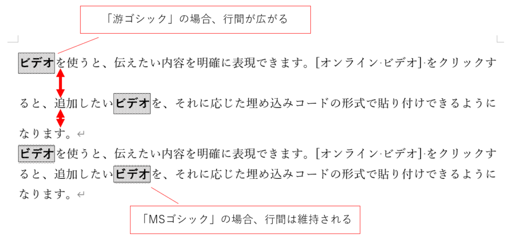 上記のスタイルを設定する場合には、設定後に行間が変化することがあります。みなさんもなんとなく経験的にご存じのことかもしれません。みなさんが、「なんとなく経験したことがある」と感じる理由は、この行間がフォントにより変化したり変化しなかったりするからです。たとえば、以下の例のように最近のWordで使われるようになった「游明朝」や「游ゴシック」でこのように行間が広がりますが、おなじみのフォント「MS明朝」や「MSゴシック」では広がりません。