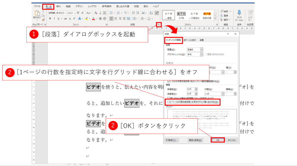 段落書式を変更する場合には、操作対象の段落を選択し(または、操作対象の段落にカーソルを置き)、[ホーム]タブの[段落]ダイアログボックス起動スイッチをクリックしてダイアログボックスを起動します。以下の図の操作をすることで、行間をフォントから独立して設定できます。細かく設定する必要がある場合には、この[インデントと行間隔]タブの[間隔]グループの項目で設定をします。