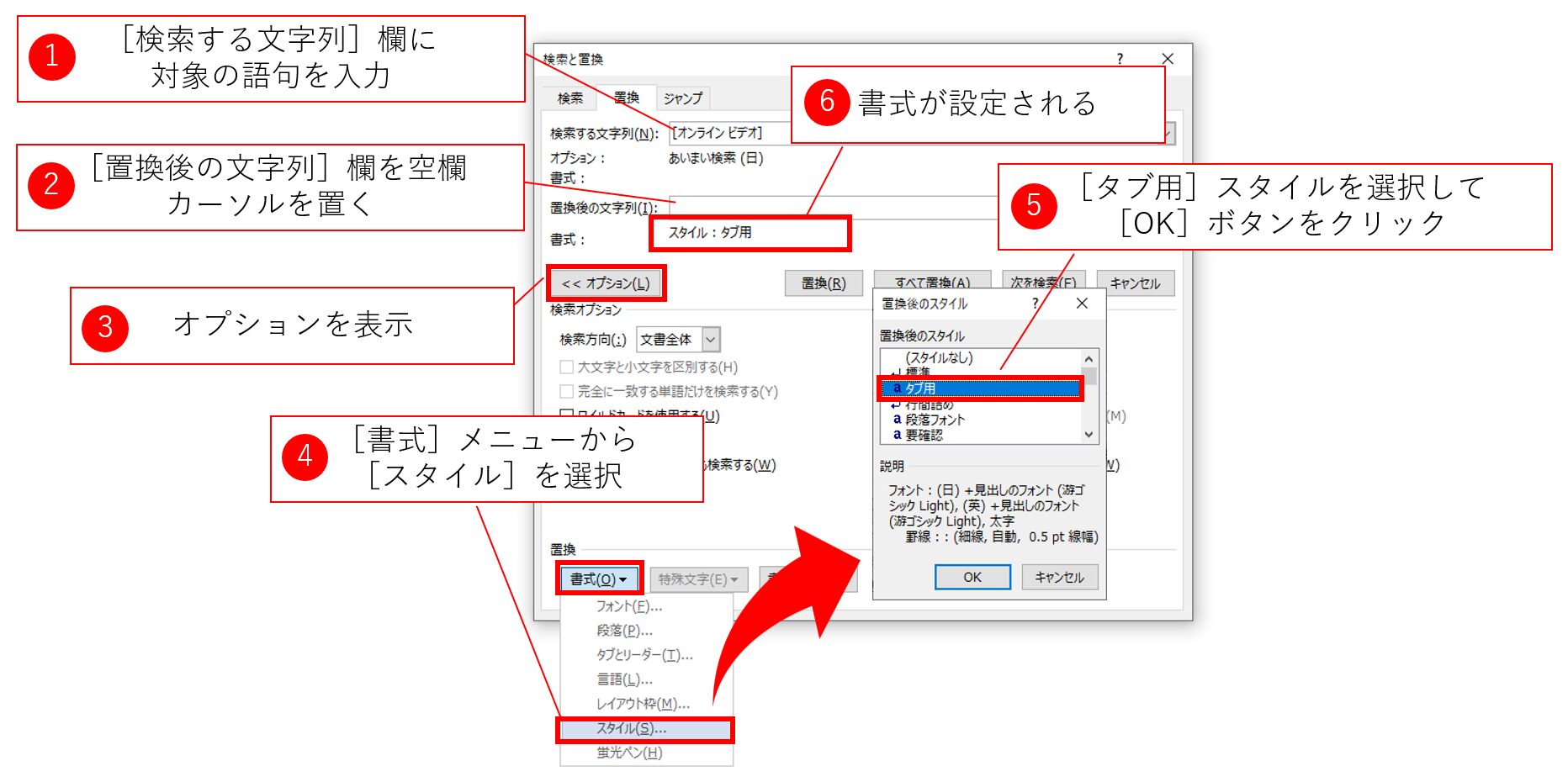 スタイルを置換後の文字列に設定する場合も、これまでの方法と同じです。今回は独自スタイルである「タブ用」という名称のスタイルが定義されている前提で手順を説明します。