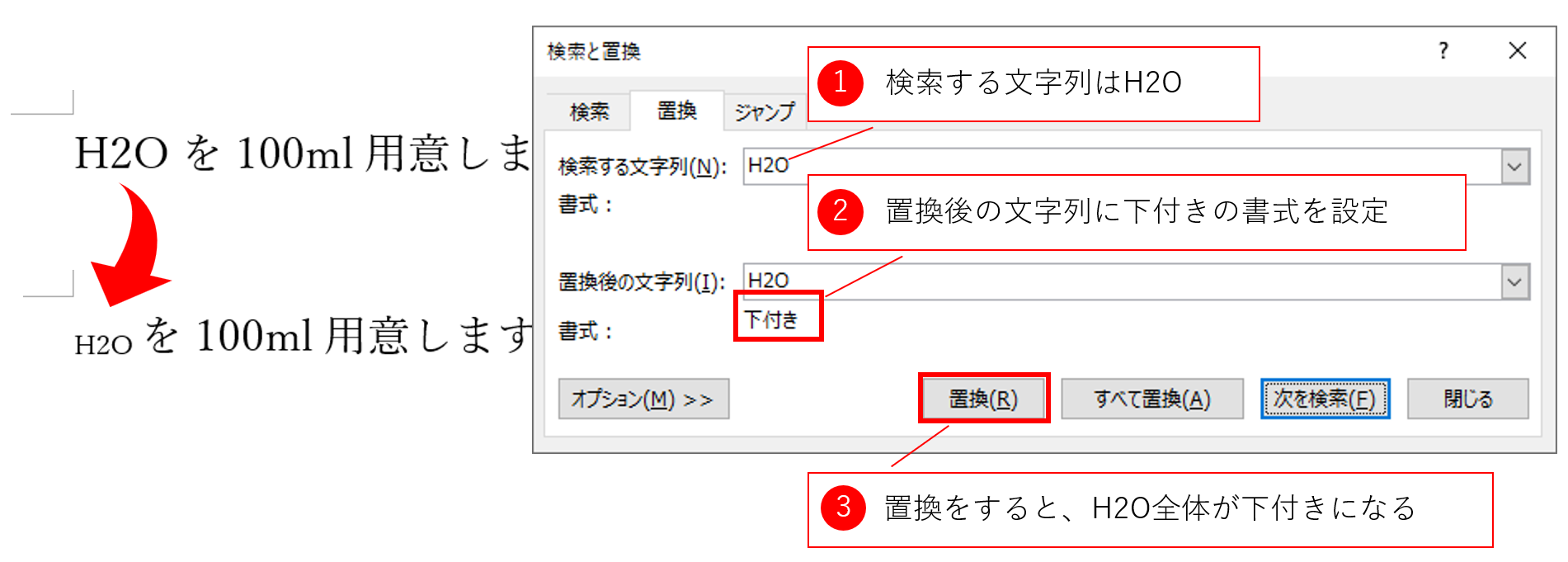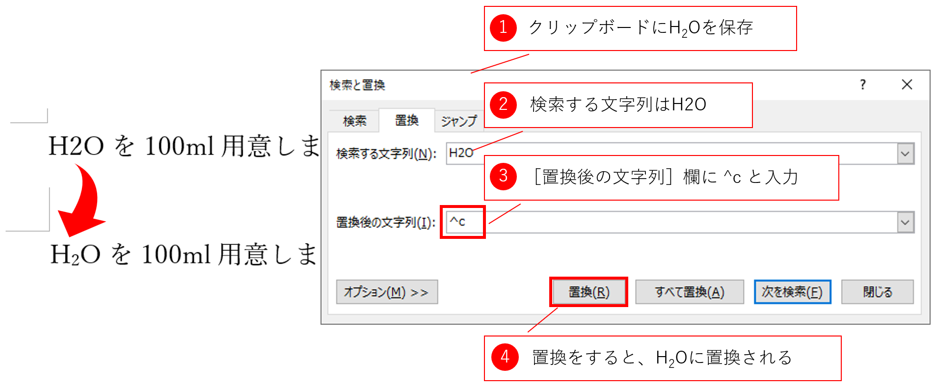 では、[検索と置換]ダイアログボックスの具体的な使い方を紹介します。[Ctrl]+[H]のショートカットキーで[検索と置換]ダイアログボックスの[置換]タブを開きます。H2Oと書かれている箇所をH2Oに置換するには、下図のように設定します。もちろん、クリップボードには、「H2O」を保存しておくことをお忘れなく。