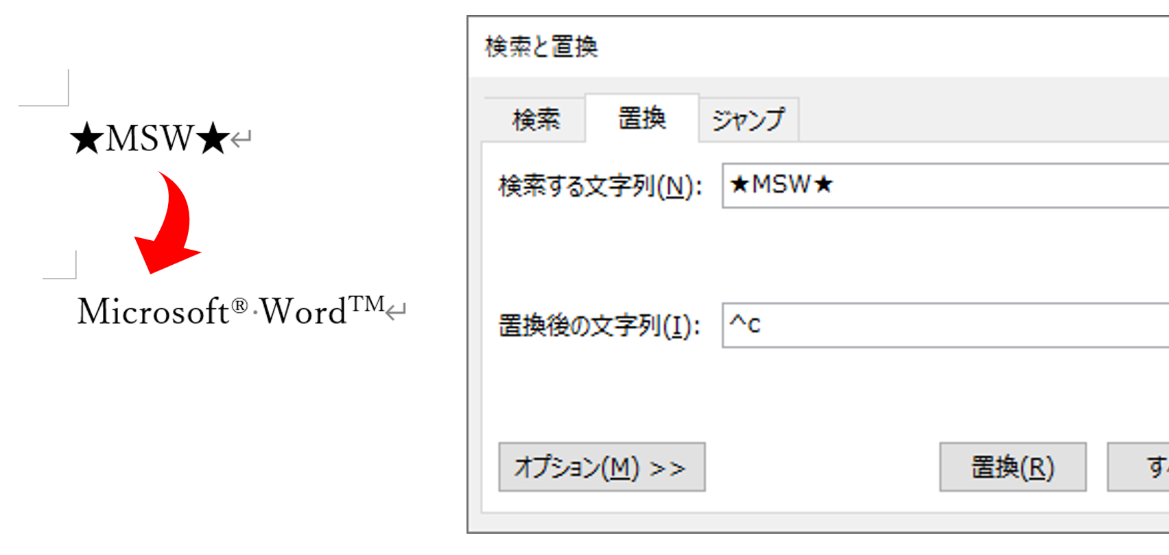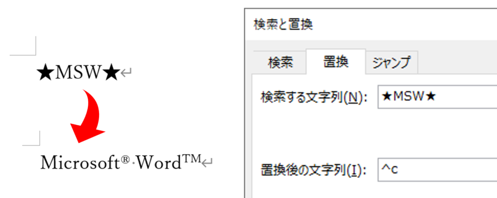 今回のように置換の対象がH2O程度であれば文書作成中に文字入力をすればいいでしょう。しかし、Microsoft® WordTMのような長い文字列の場合には、文書作成後の置換のルールと組み合わせて、文書作成中の文字入力自体も省力化できます。つまり、「★MSW★」のように文書のほかの箇所で使われていない表記にしておき、[検索する文字列]欄に「★MSW★」を入力し、[置換後の文字列]欄に「^c」を入力するのです。このとき、他で使われていない表記なので[すべて置換]ボタンを用いて一括で置換できます。