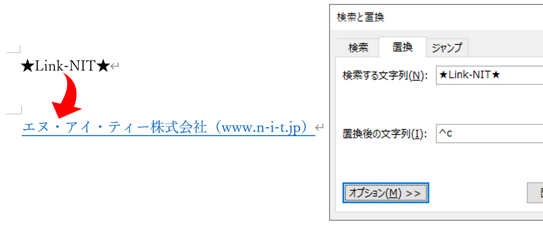 このように、「文書作成中に仮の文字列を入力し、文字入力が終わった段階で仮の文字列を置換して正しい表記にする」という手法は、さまざまな用途で応用できます。自分用のルールを作ればいいだけなので、リンクも挿入できます。たとえば、文書作成中には「★Link-NIT★」と入力しておき、文書完成後にリンクに置換します。