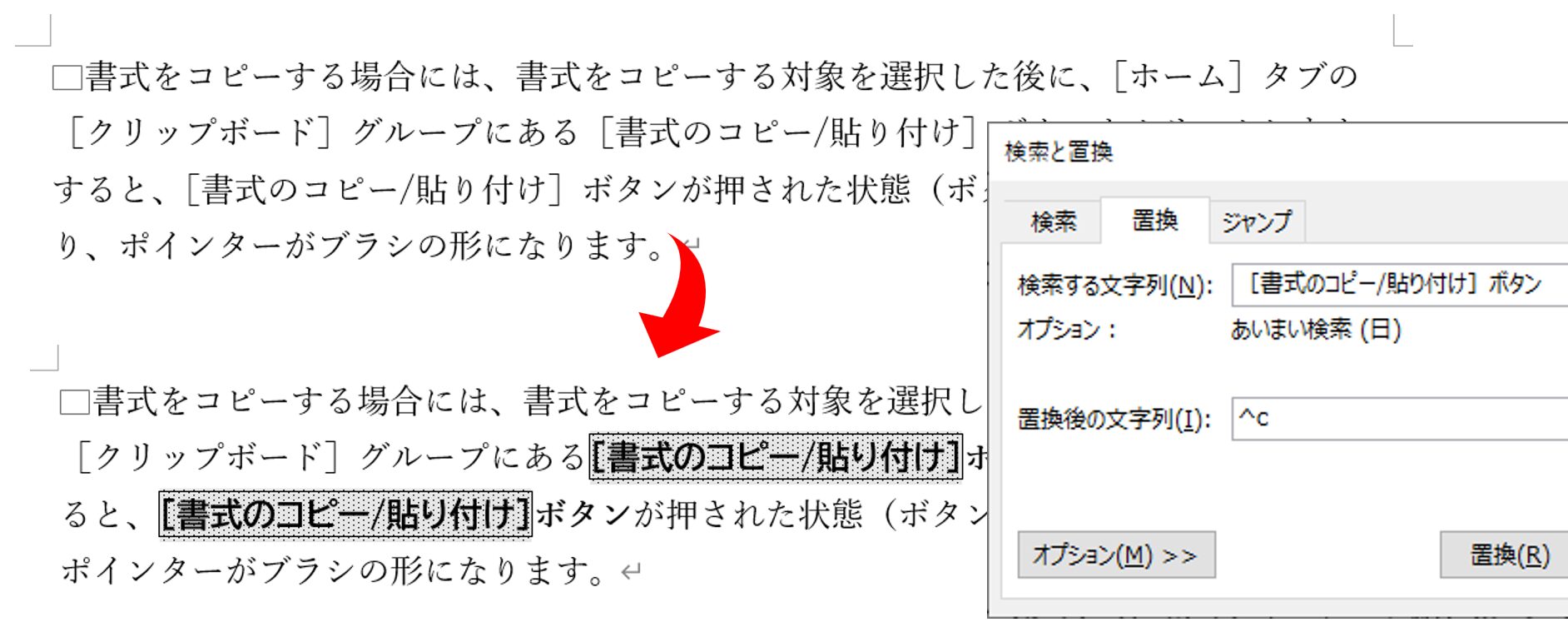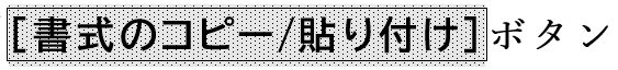 同様に、以図の「[書式のコピー/貼り付け]ボタン」のように、文字列に部分的にスタイルや書式を組み合わせて設定した場合にも、置換では正確に反映できません。以下の場合、文字列の前半部分([書式のコピー/貼り付け])には塗りつぶし(背景の色)とフォント、太字の設定を合わせた独自の「ボタン用」スタイルが設定されています。そして文字列の後半部分(ボタン)には文字書式の「太字」のみが設定されています。