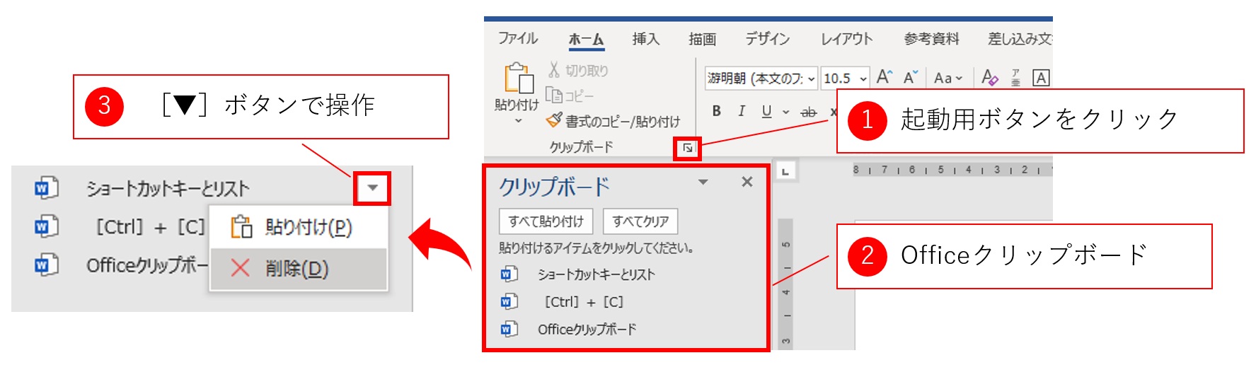 Officeクリップボードを使えば、過去24回のクリップボードの内容を表示できます。以下の図のように、[ホーム]タブの[クリップボード]グループの右端にある起動用ボタンで[クリップボード]ウィンドウが開きます。リストの一番上に最新のクリップボードの内容が表示され、以下時系列に並びます。各項目をクリックすれば、カーソル位置に貼り付けができます。また、項目の右端にマウスオーバーすると[▼]ボタンが表示されるので、ここから貼り付けや削除ができます。