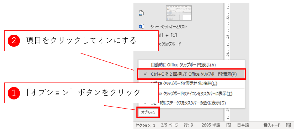 この作業ウィンドウの下端にある[オプション]ボタンをクリックすると設定項目が表示されます。以下の図のように設定すると、[Ctrl]+[C],[C]([Ctrl]キーを押しながら[C]キーを2回押す)のショートカットキーでOfficeクリップボードを表示できるので確認作業がはかどります。