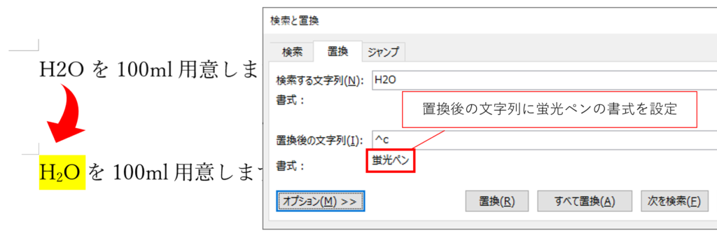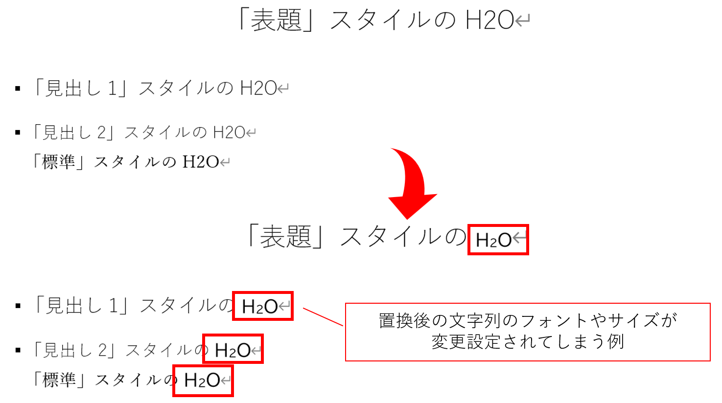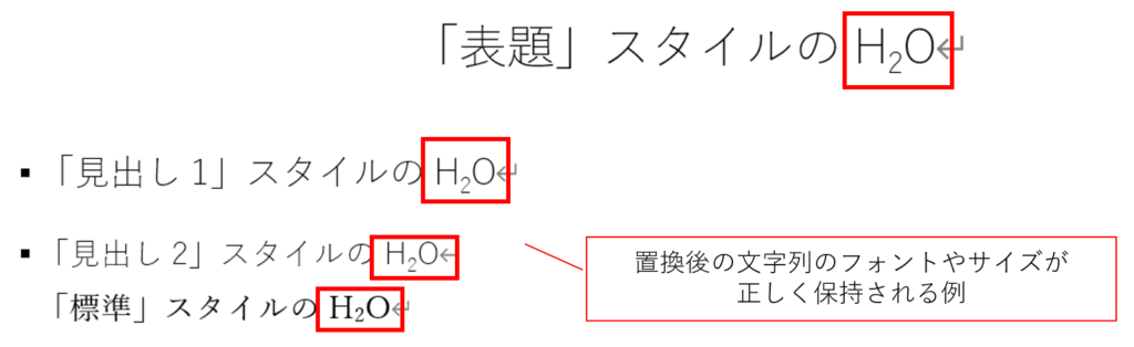 この設定であれば、以下のように「游ゴシック Light」の「12ポイント」の「見出し1」に書かれたH2Oを置換したときには、置換後のH2Oのフォントは置換前と同じ「游ゴシック Light」の「12ポイント」ということになります。