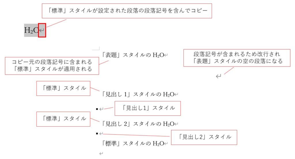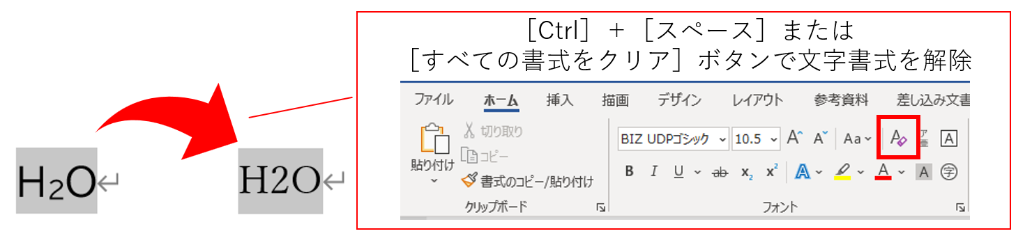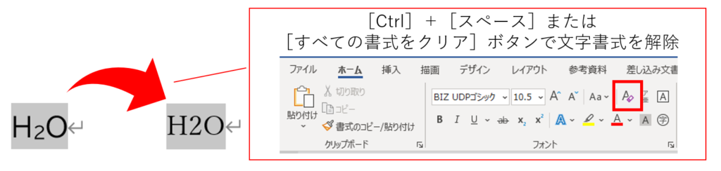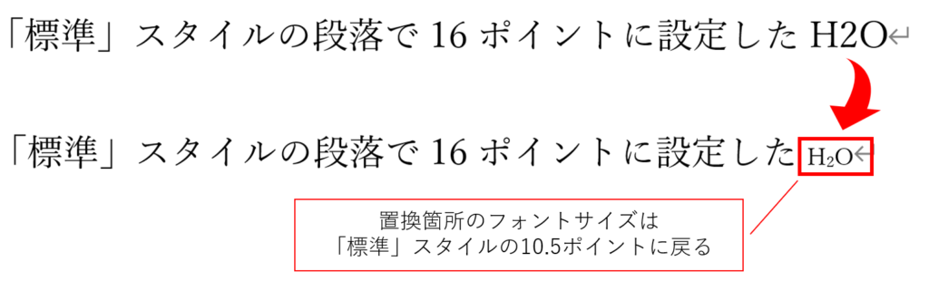 上記の図では、置換後の「H2O」をクリップボードに保存した際に、「BIZ UDPゴシック」と「10.5ポイント」のフォントサイズという文字書式が設定された「H2O」からコピーをしてしまいました。そのために、置換した箇所のフォントとサイズが変わってしまったのです。