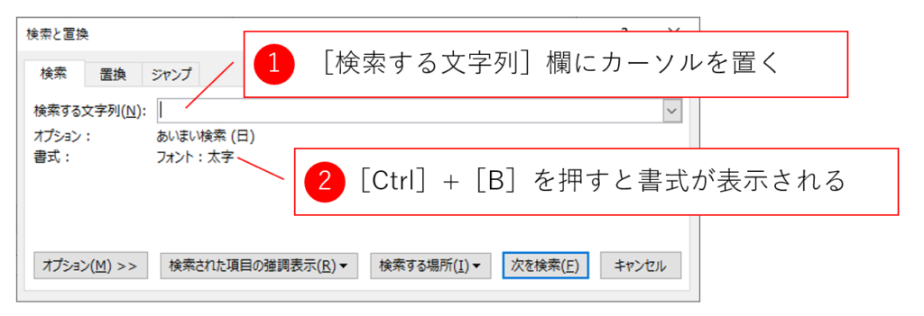検索する文字列に書式の条件を追加するときには、[検索する文字列]欄にカーソルを置いた状態でショートカットキーを押します。同様に、置換後の文字列の場合には、[置換後の文字列]欄にカーソルを置いてください。以下の例では、検索する文字列に太字の書式を設定する場合の操作です。[Ctrl]+[B]を1度押すと「太字」が設定され、2度押すと「太字(なし)」が設定され、3度押すと設定自体が解除されます。