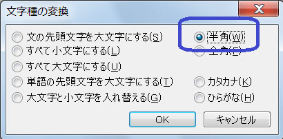 (5)「文字種の変換」ダイアログで「半角」を選んで実行します。