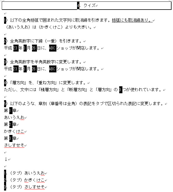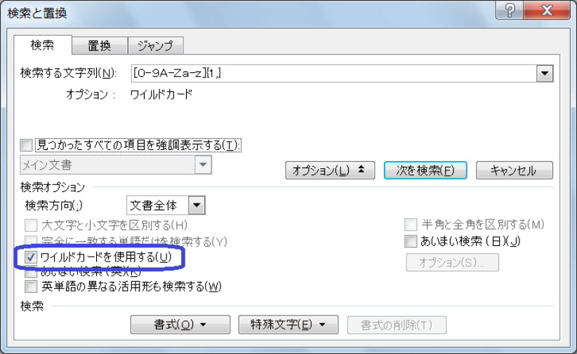 1.ワイルドカードを使って文書中の全角英数字をすべて選択します。