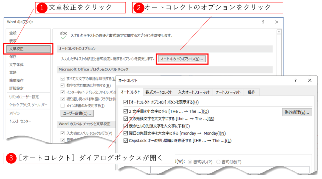 [Wordのオプション]ダイアログボックスで、以下の操作をすると[オートコレクト]ダイアログボックスが表示されます。