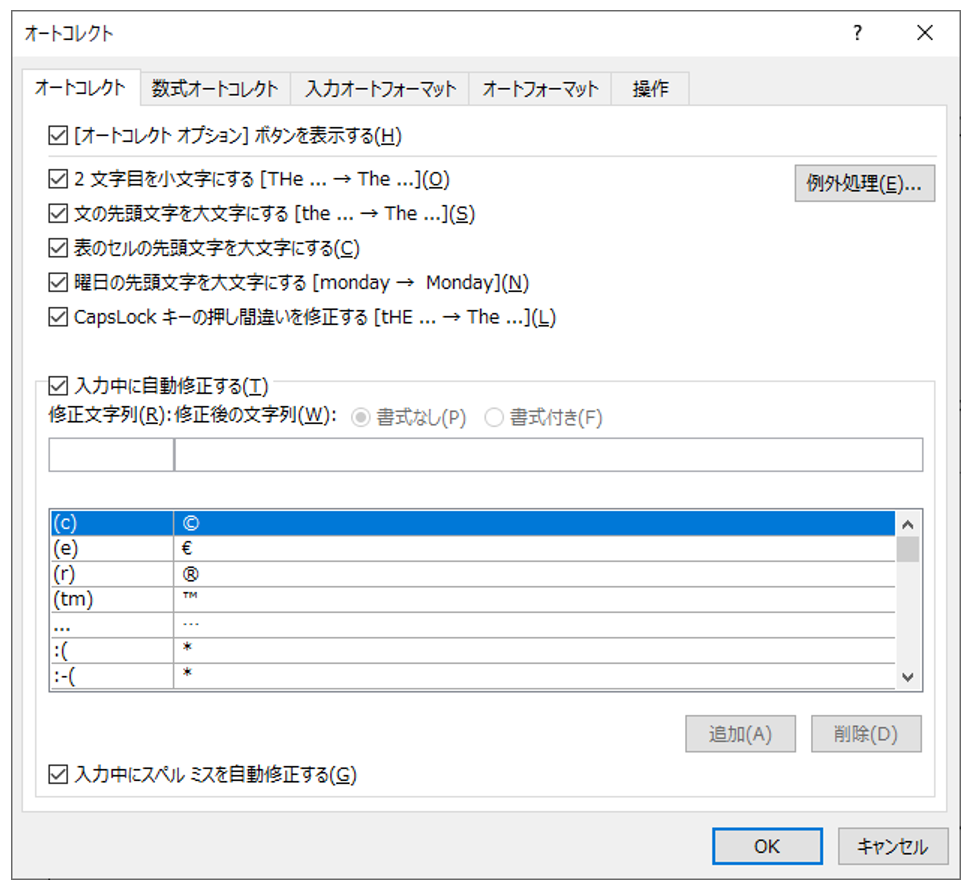 このダイアログボックスには、[オートコレクト]、[数式オートコレクト]、[入力オートフォーマット]、[オートフォーマット]、[操作]の5つのタブがあり、合計50以上の設定項目があります。