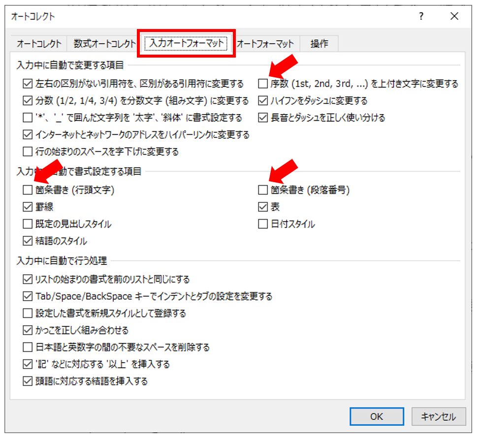 このことで、本項の冒頭で説明をした「段落先頭に番号や記号が勝手に入力されること」や「1st、2ndと入力すると1st、2ndのように勝手に変換されること」の抑制になります。