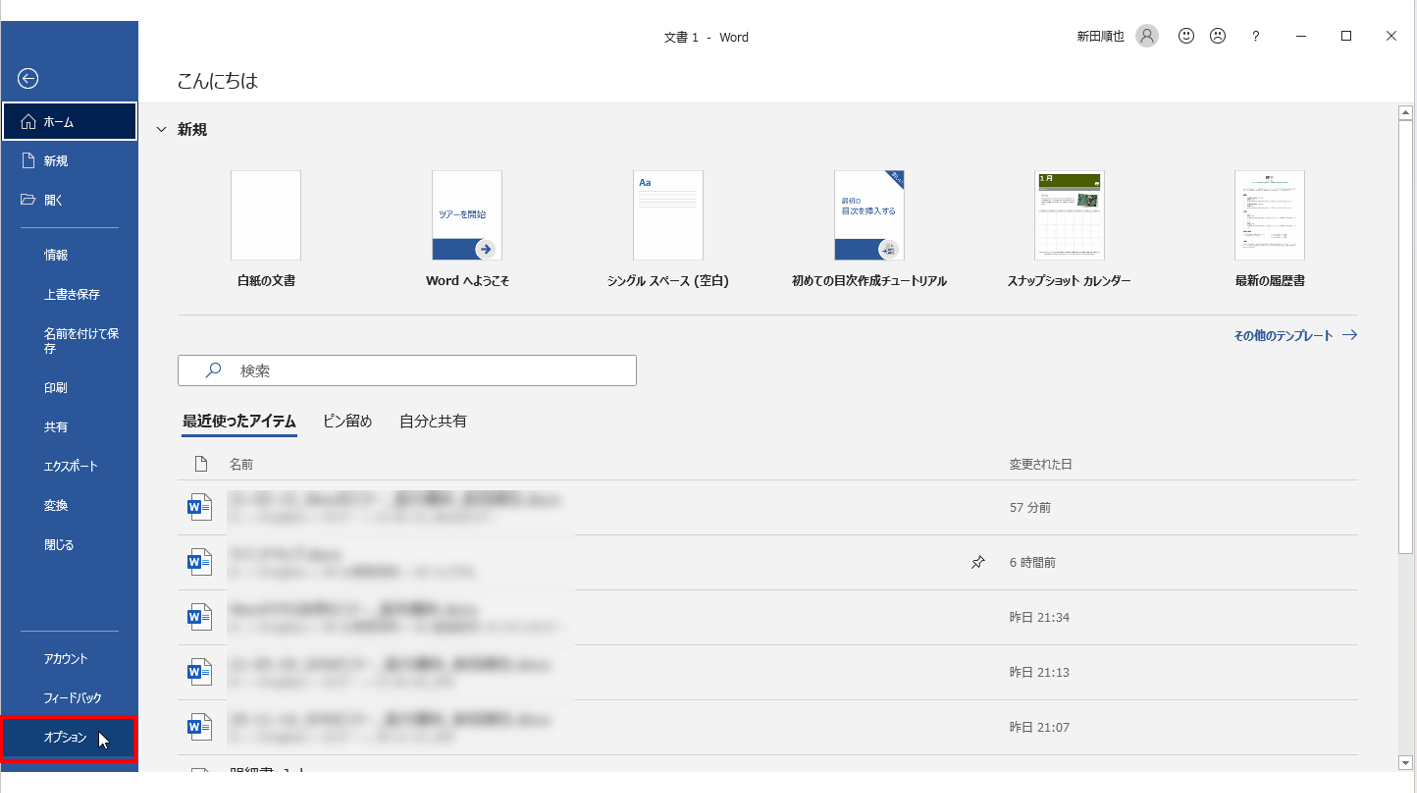 Wordの画面の一番左側にある[ファイル]タブをクリックするとバックステージビューと呼ばれる画面が表示されます。この画面の左下にある[オプション]ボタンをクリックすると[Wordのオプション]ダイアログボックスが表示されます。