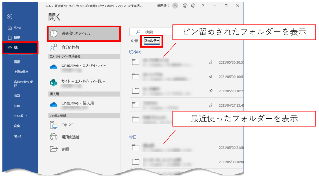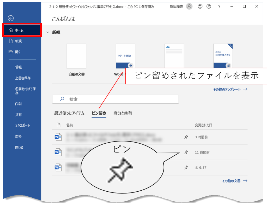 よく使うファイルやフォルダーに素早くアクセスするために、「ピン留め」機能を使いましょう。Backstage(バックステージ)ビューを使い、最近使用した文書やフォルダーを「ピン留め」で整理してみます。