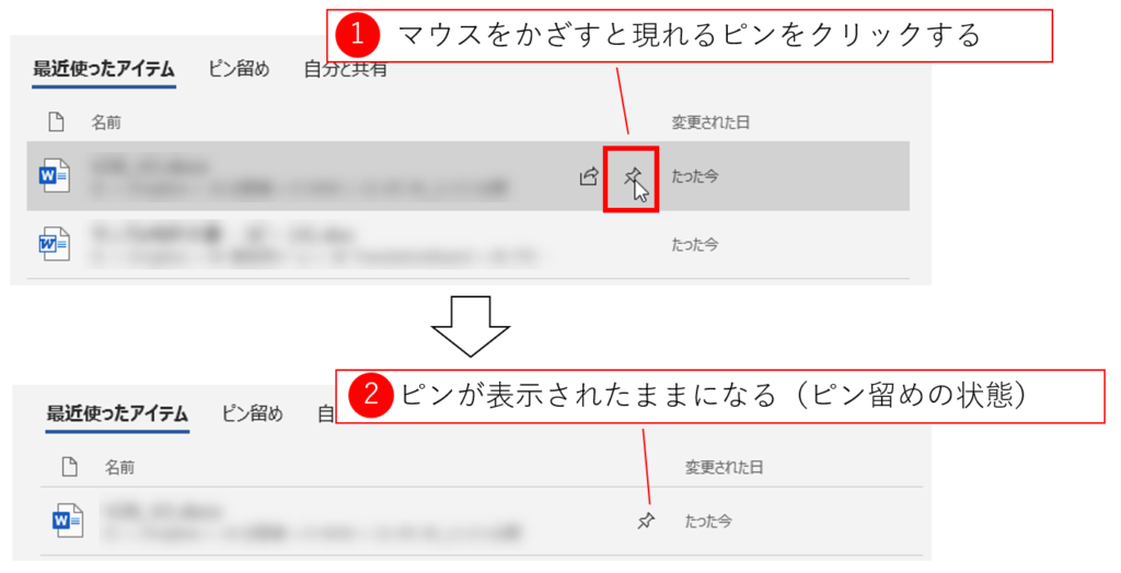 ピン留めの方法は簡単です。ファイル名の近くにマウスをかざすと項目が灰色になりピンが現れます。このピンをクリックするとファイルがピン留めされます。このリストからピンを外す場合にも、ピンをクリックすればいいのです。直感的に操作できます。