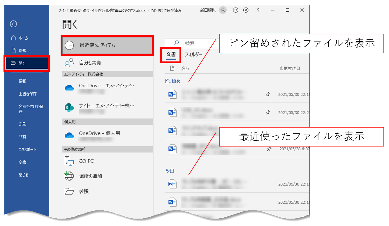 次に、[開く]画面を見てみましょう。この画面では、[ホーム]画面に表示されないファイルを選択できるようになります。ここでも「最近使ったアイテム」と「ピン留め」がキーワードになります。