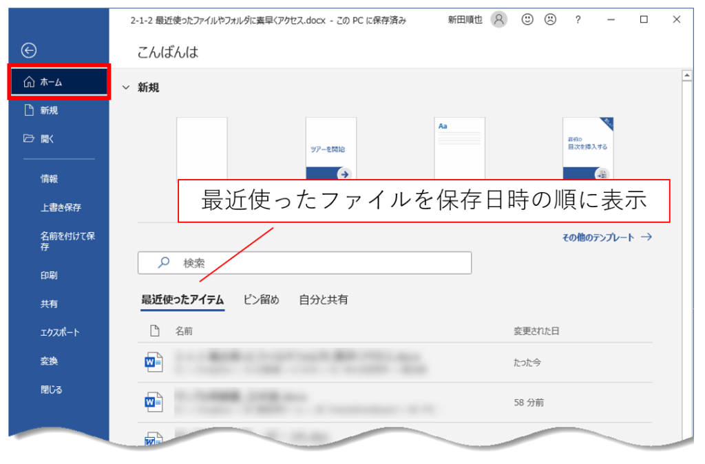 [ファイル]タブをクリックした直後は[ホーム]画面が表示されています。この[ホーム]画面では、右側のエリアには新規ファイルの作成と既存ファイルを開くためのアイコンが表示されています。左側の青い帯には、Wordの細かな操作のための項目が列挙されています。