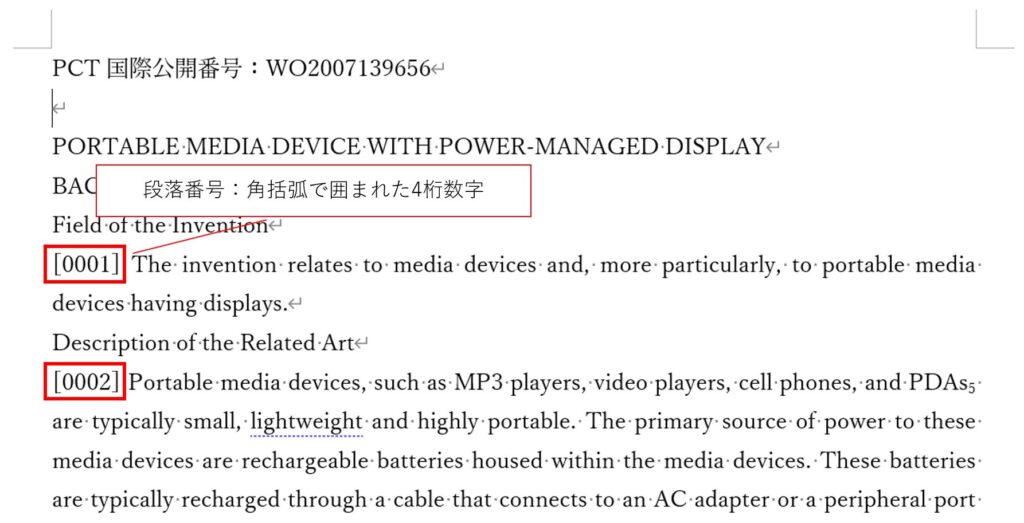 英文の特許明細書をご存じの方はそれほど多くないと思いますが、ルール作りの一例です。以下の図のように、段落番号を記述する場合に半角の角括弧で囲まれた4桁半角数字を使います。