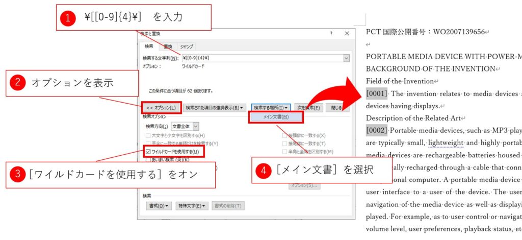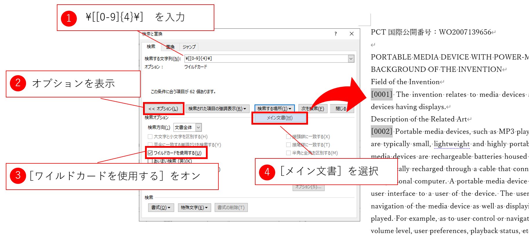 この記事では、ワイルドカード検索の別の事例として特許明細書の段落番号を取り上げます。