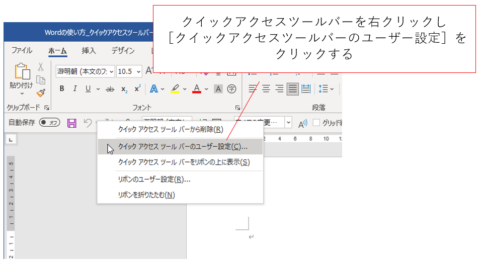 カスタマイズの基本は「右クリック」です。今回も右クリックから始めます。クイックアクセスツールバー上で右クリックをし[クイックアクセスツールバーのユーザー設定]をクリックします。