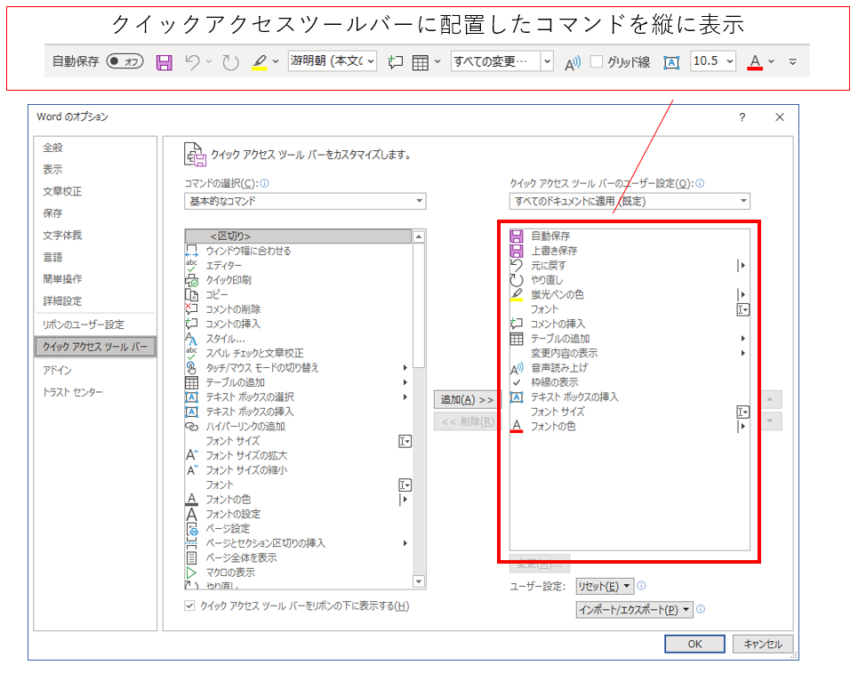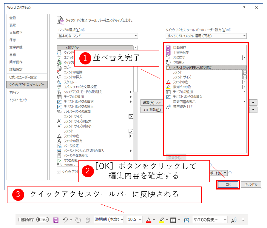 このように、追加や削除、並べ替えの操作を繰り返したのちにダイアログの右下にある[OK]ボタンをクリックしてダイアログボックスを閉じます。すると、クイックアクセスツールバーに編集後のボタンが表示されます。