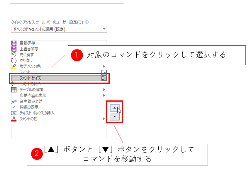 ダイアログの右半分の表示欄に、現在クイックアクセスツールバーに追加されたコマンドのアイコン(ボタンイメージ)と名前(コマンド名/機能名)が表示されています。クイックアクセスツールバーのボタンは横に並びますが、このダイアログではコマンドが縦に表示されています。このコマンドを上下に移動することで、クイックアクセスツールバー上でボタンを左右に移動します。