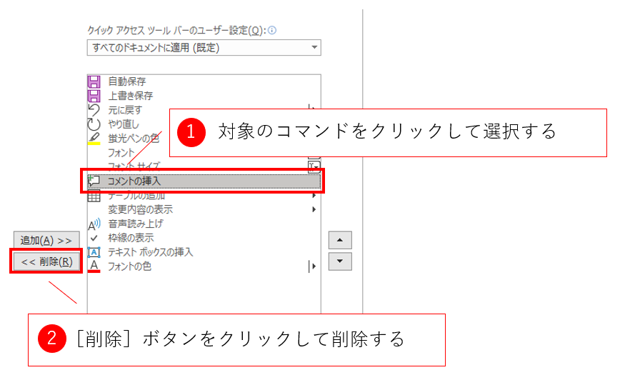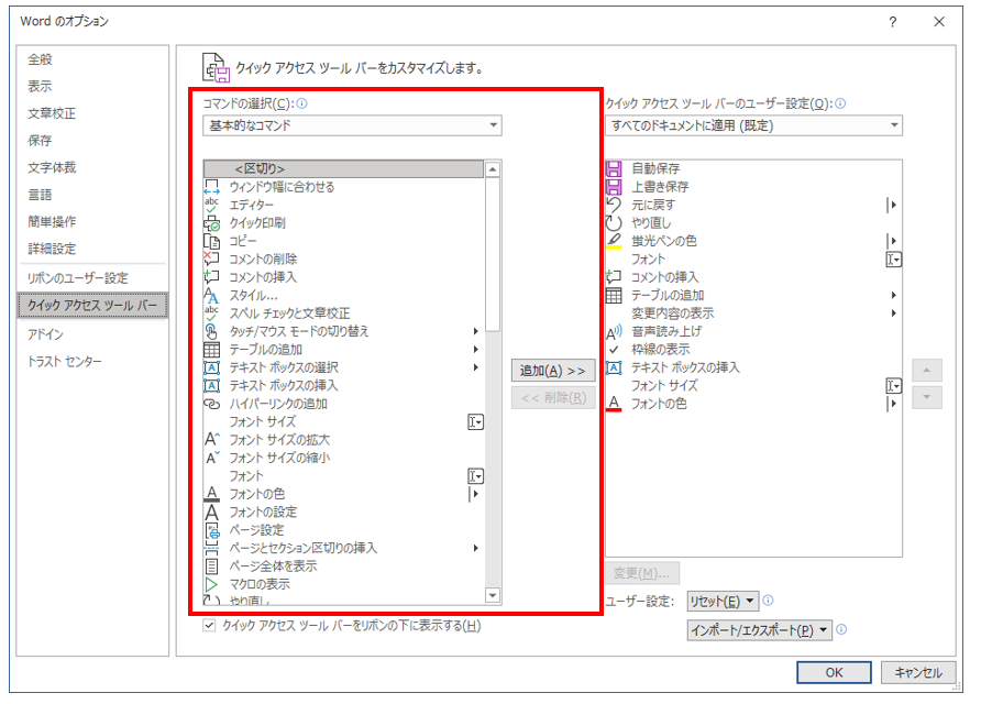表示されるダイアログでクイックアクセスツールバーに配置するボタンを編集します。Wordでは機能のことを「コマンド」と呼んでおり、このダイアログでは、クイックアクセスツールバーに表示するコマンド用のボタンの位置の変更、削除、追加ができます。順を追って説明します。