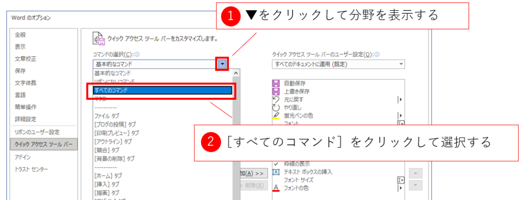 Wordには2000種類を超えるコマンドがあります。この膨大な数のコマンドから必要な1つを見つけ出すのは大変ですから、コツをつかんで素早く探してみましょう。まず、図にあるように[コマンドの選択]のリストから関係する分野を選ぶと関係するコマンドを絞り込めます。この絞り込みにより、[ホーム]タブ[挿入]タブなどそれぞれのタブに関係したコマンドを絞り込めますが、場合によっては、タブに表示されているボタンであればタブ上で右クリックをして追加したほうが素早く追加できます。簡単な追加方法を選んでみてください。