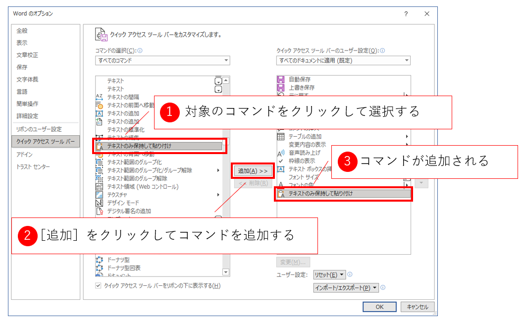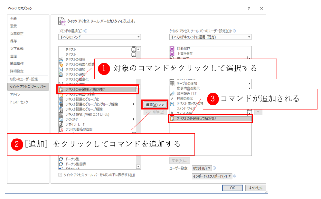 今回追加する[テキストのみ保持して貼り付け]はカタカナなので比較的簡単に見つけられす。見つけたらこのコマンドをクリックして選択し、[追加]ボタンをクリックします。すると、右側のクイックアクセスツールバーの項目の末尾(または選択された箇所)にコマンドが追加されます。