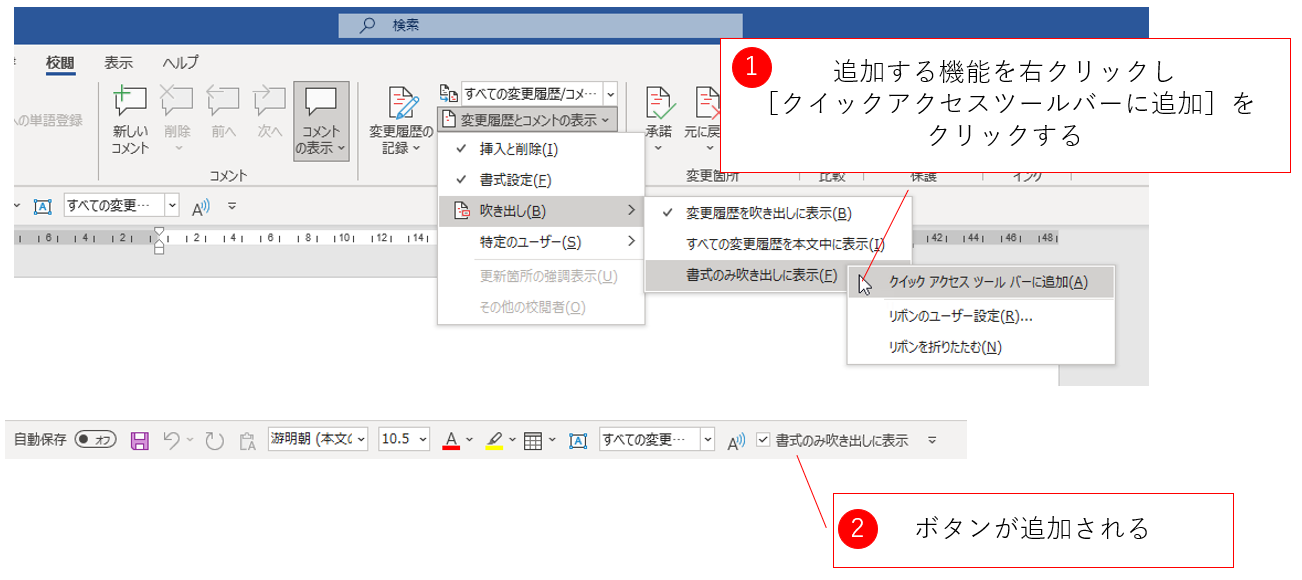 私たちがよく使う機能(コマンド)には、リボンのタブを開けばすぐにクリックできる機能と、プルダウンメニューの中からクリックする機能とがあります。たとえば、変更履歴の「吹き出し」に表示する内容を書式のみにする場合には、以下のように[校閲]タブで複数回のクリックをする必要があります。このようにプルダウンメニューを表示し対象の機能を選択するのは手間がかかりますから、よく使う機能であればぜひクイックアクセスツールバーに追加したいですね。