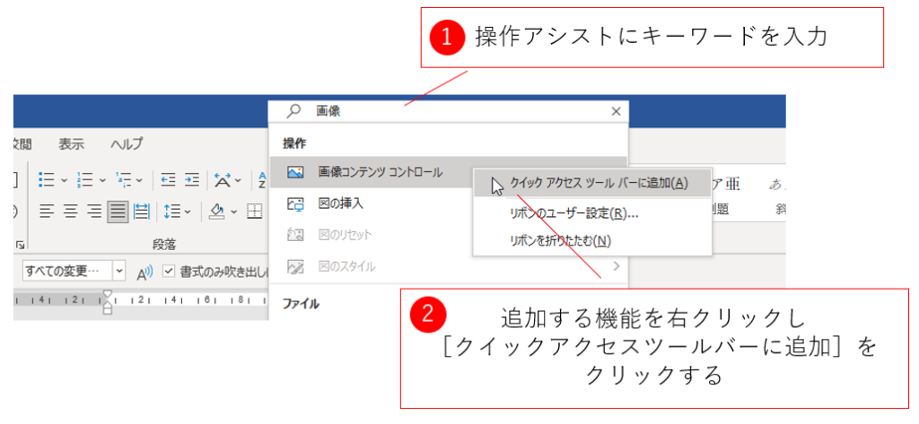 検索結果に機能が表示されたら「右クリック」のメニューから[クイックアクセスツールバーに追加]を選択します。これだけでボタンを追加できます。