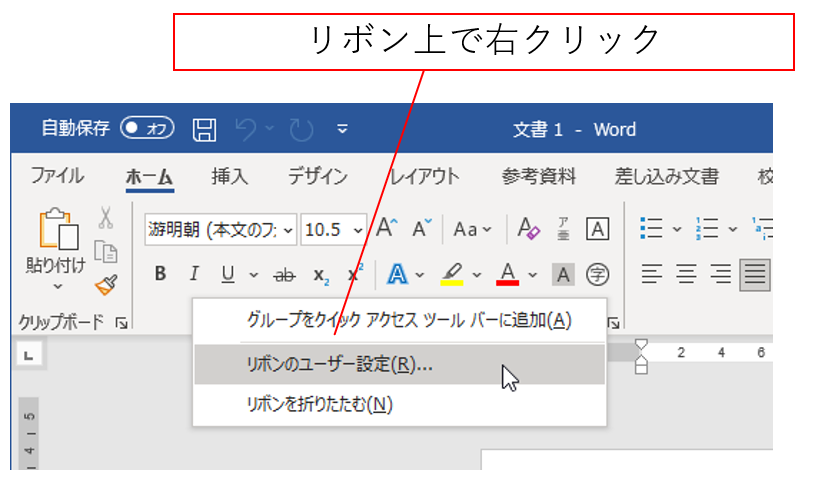 リボン上で右クリックをすると[リボンのユーザー設定]が表示されます。この[リボンのユーザー設定]をクリックすると編集用の画面が開きます。