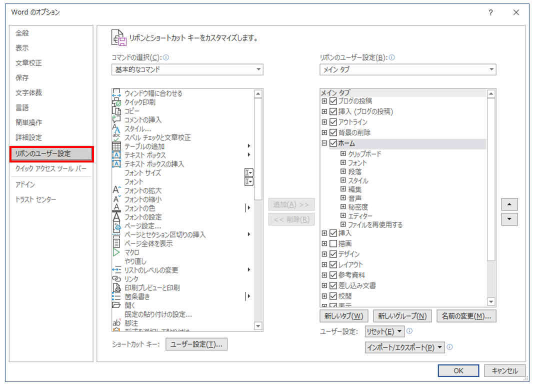 【Word】リボンのカスタマイズ:タブ・グループ・ボタンの追加方法