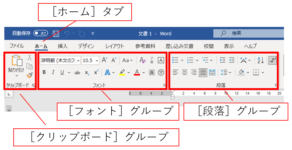 [ホーム]タブの場合、左側から[クリップボード]グループ、[フォント]グループ、[段落]グループと並んでいます。リボンのユーザー設定では、デフォルトで用意されているタブ(既存のタブ)と、デフォルトで用意されているグループ(既存のグループ)に対してできるのは、以下の項目に制限されています。