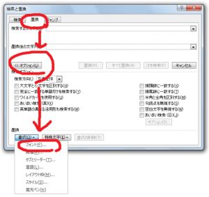 置換のタブを表示して、検索する文字列のフォントの設定画面を開きます。
